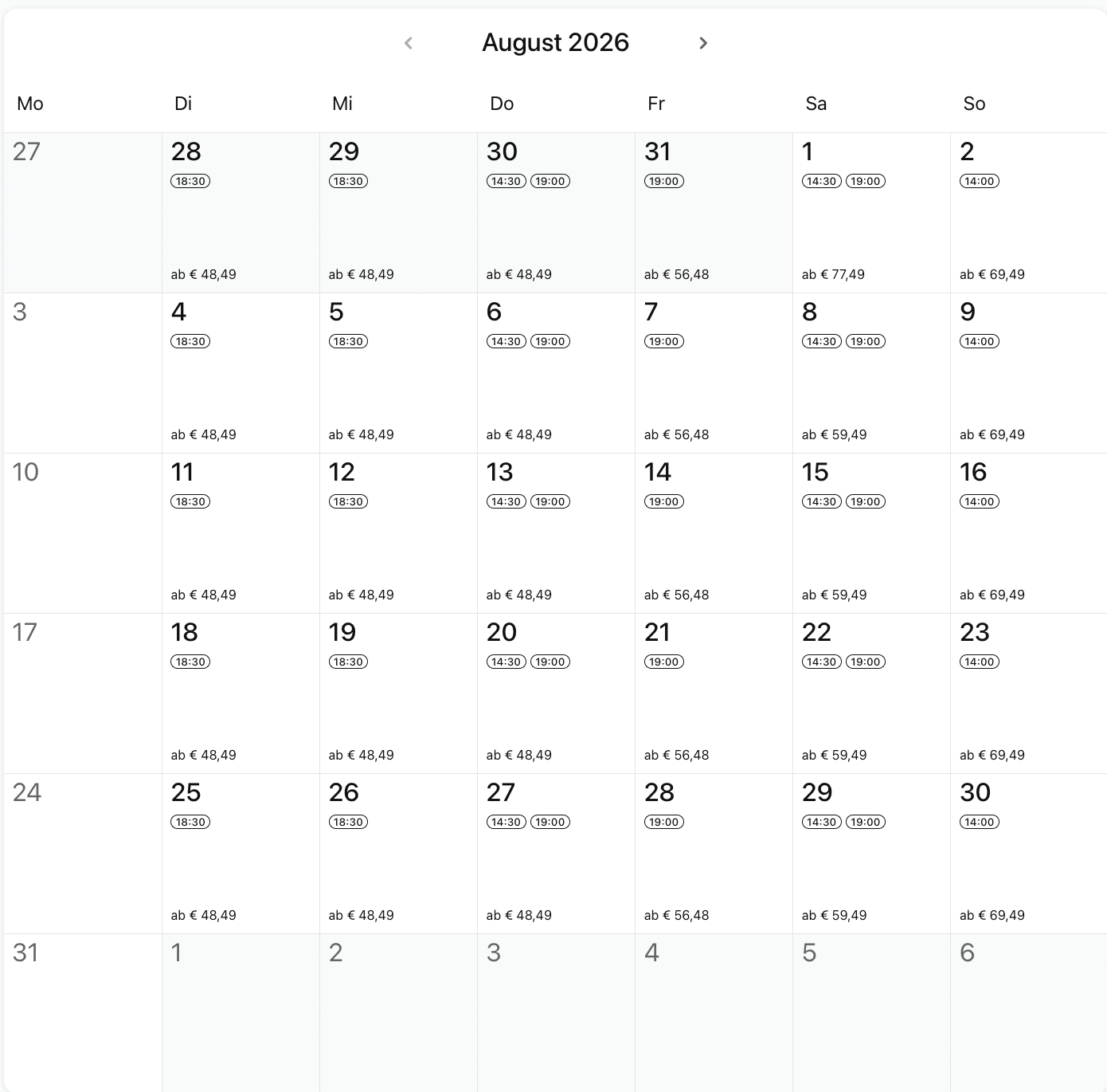 Die Tickets für das Musical „Disneys – Die Eiskönigin“ lassen sich bequem online bestellen. Dabei sind die Kartenpreise gestaffelt nach Kategorie und Veranstaltungstag. Das Theater ist dabei in 5 verschiedene Kategorien aufgeteilt, an denen sich die Ticketpreise orientieren. Die Kategorien sehen Sie übersichtlich in unserem Saalplan, der sowohl die Plätze im Parkett als auch auf dem Rang illustriert. Aber auch an der Abendkasse kann man immer wieder noch Restkarten kaufen, aber durch die Beliebtheit des Musicals, sind die Erfolgschancen an den beliebten Tagen wie Freitags bis Sonntags nur gering.